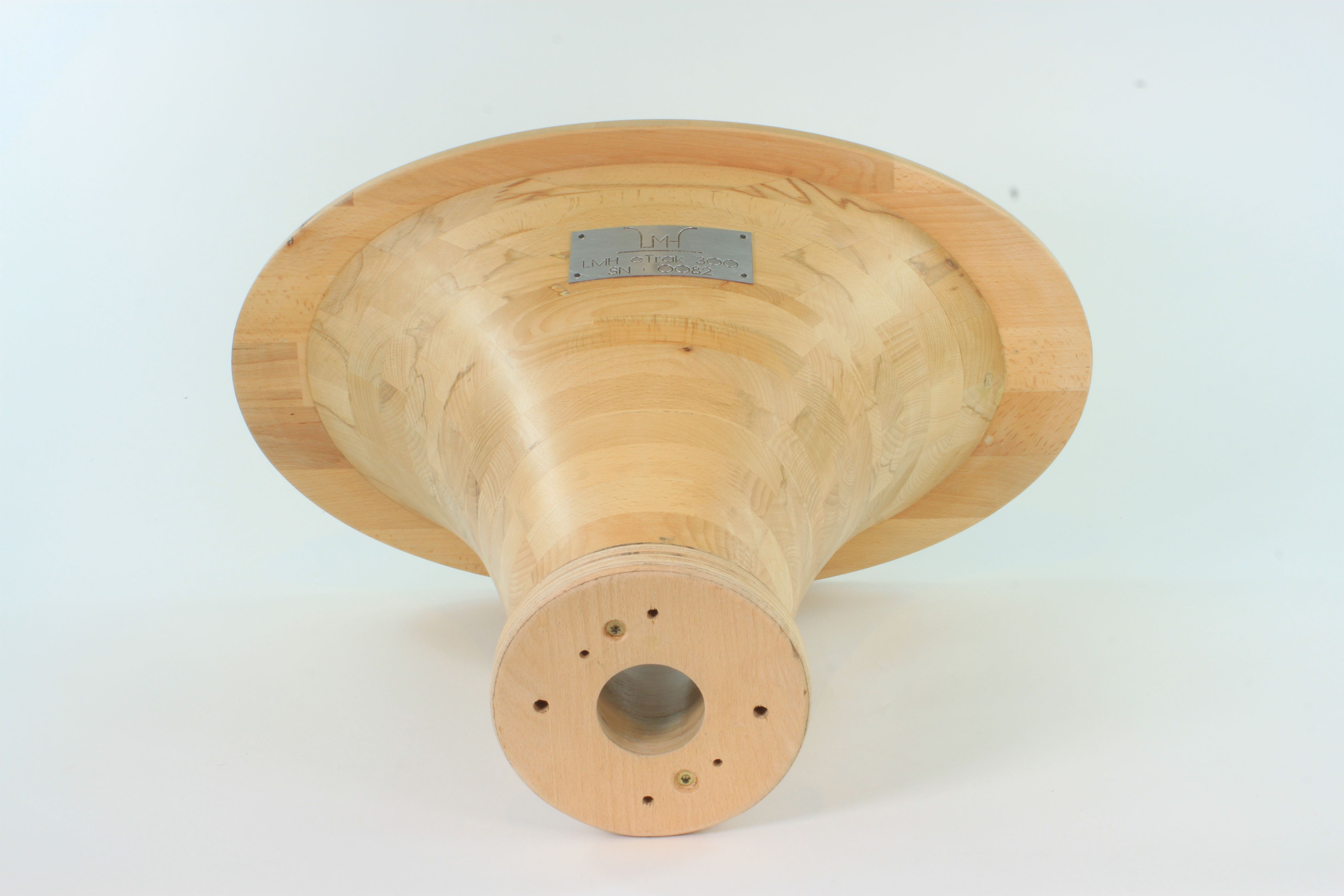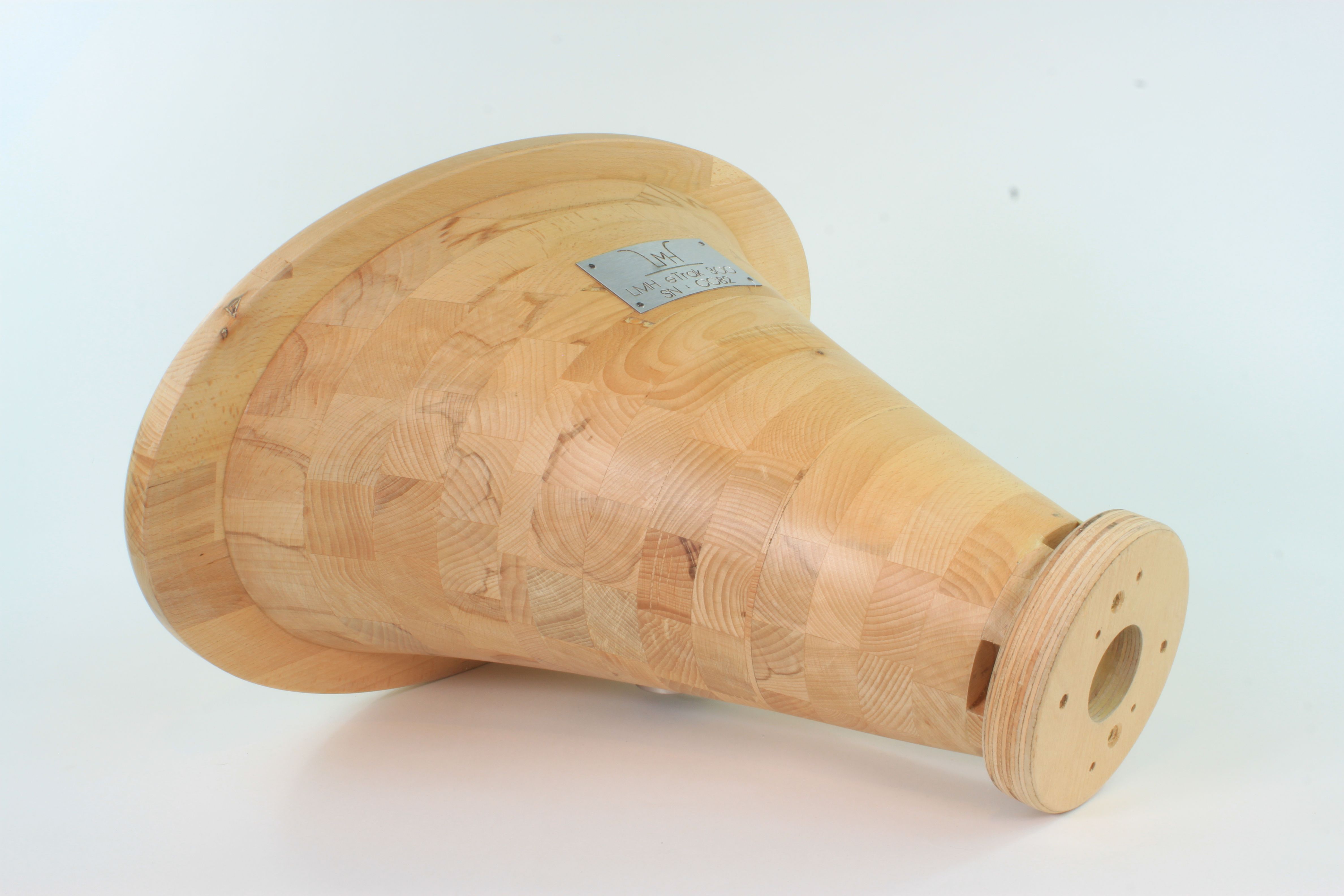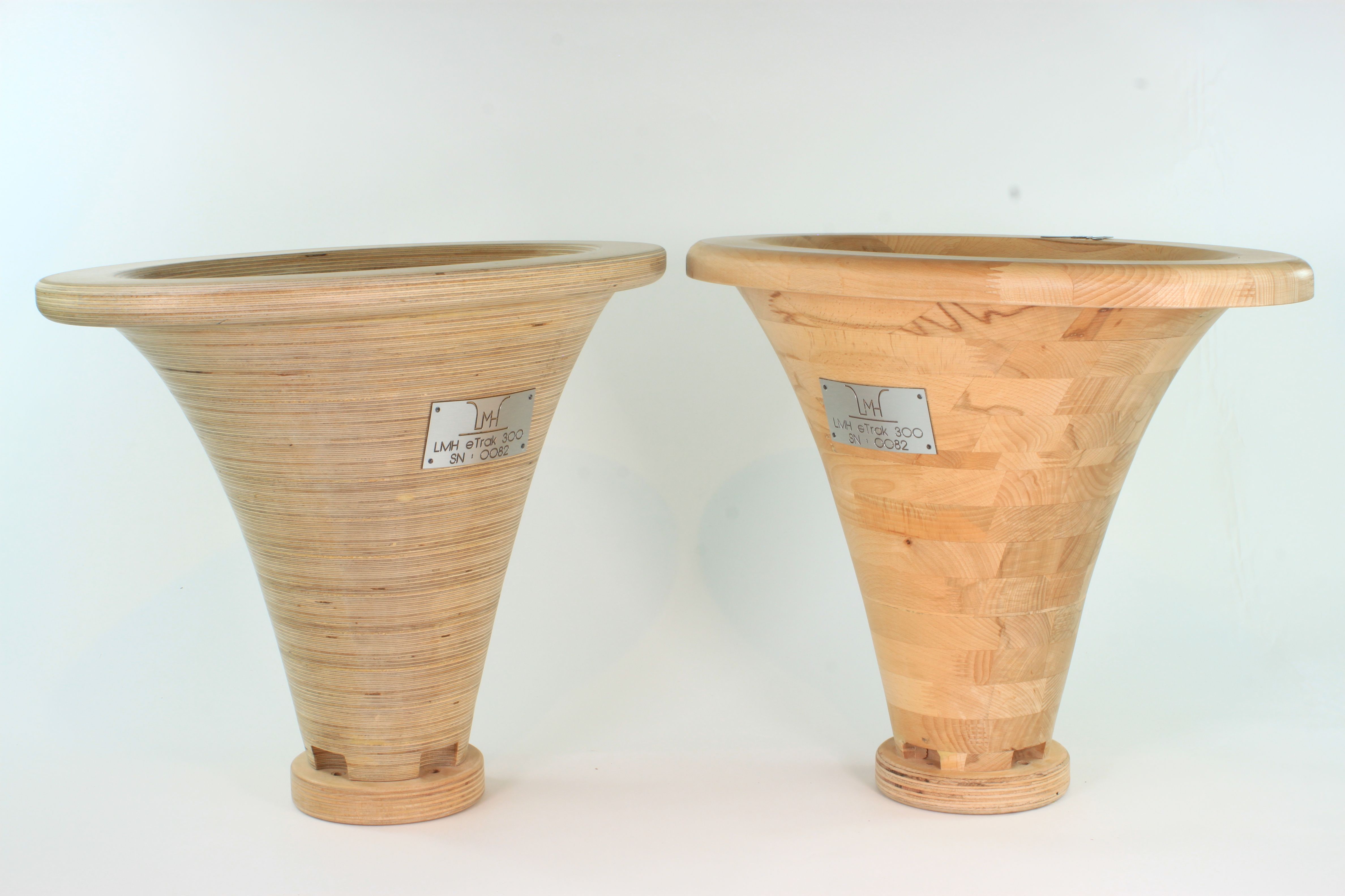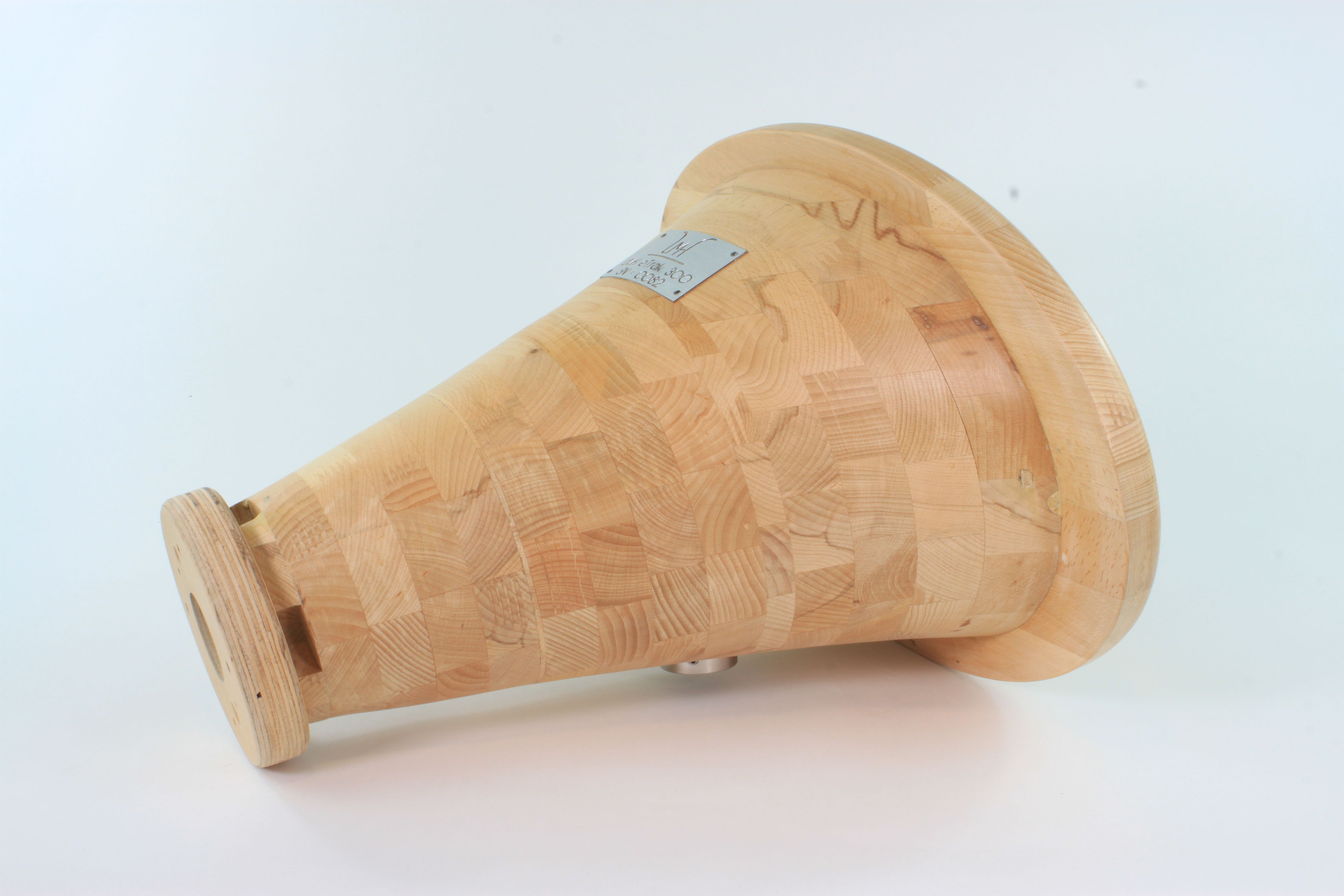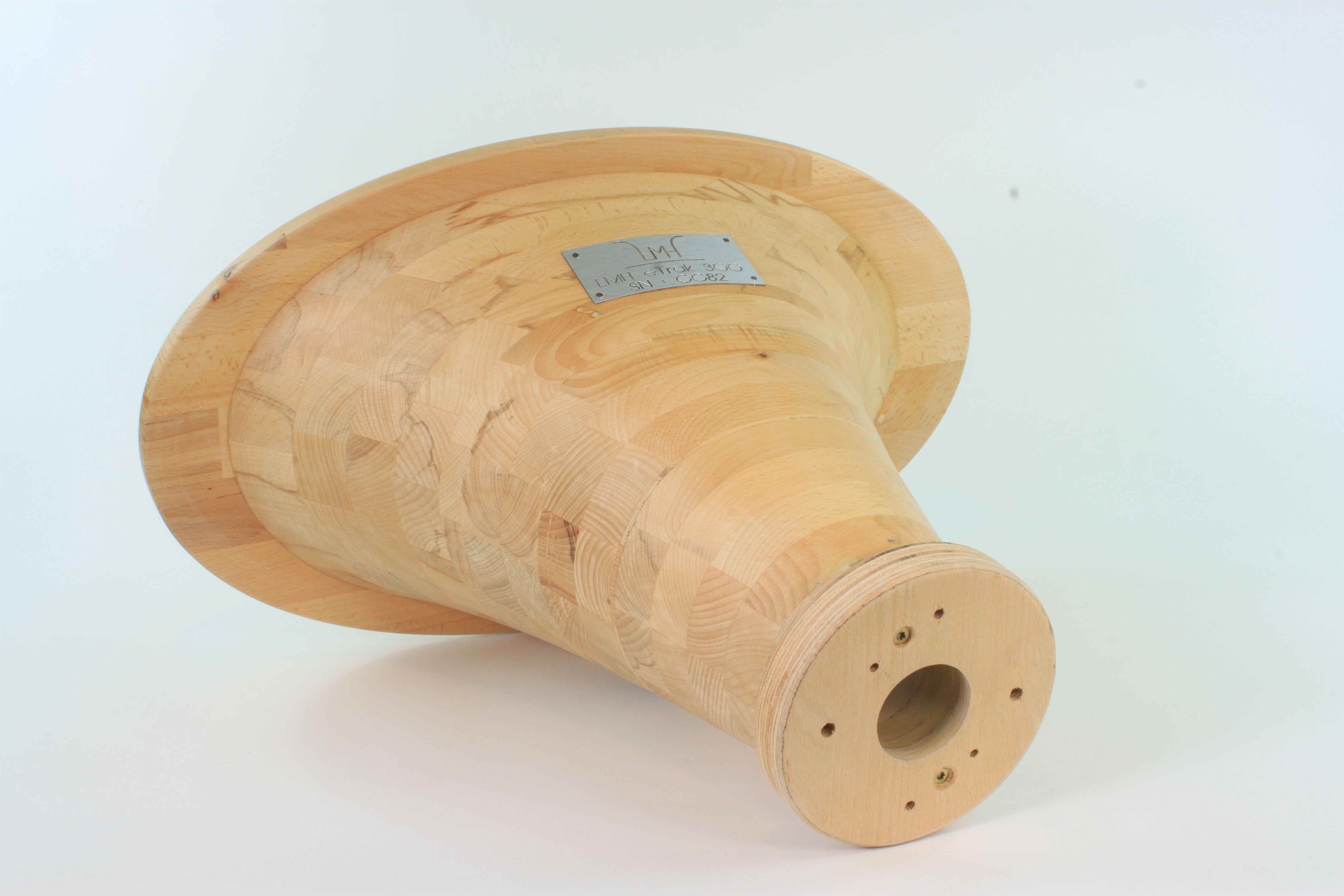 In einem speziell von uns entwickeltem Verfahren aus Vollholz gefertigte sphärisch-elliptische Mittel-Hochtonhörner höchster Güte.