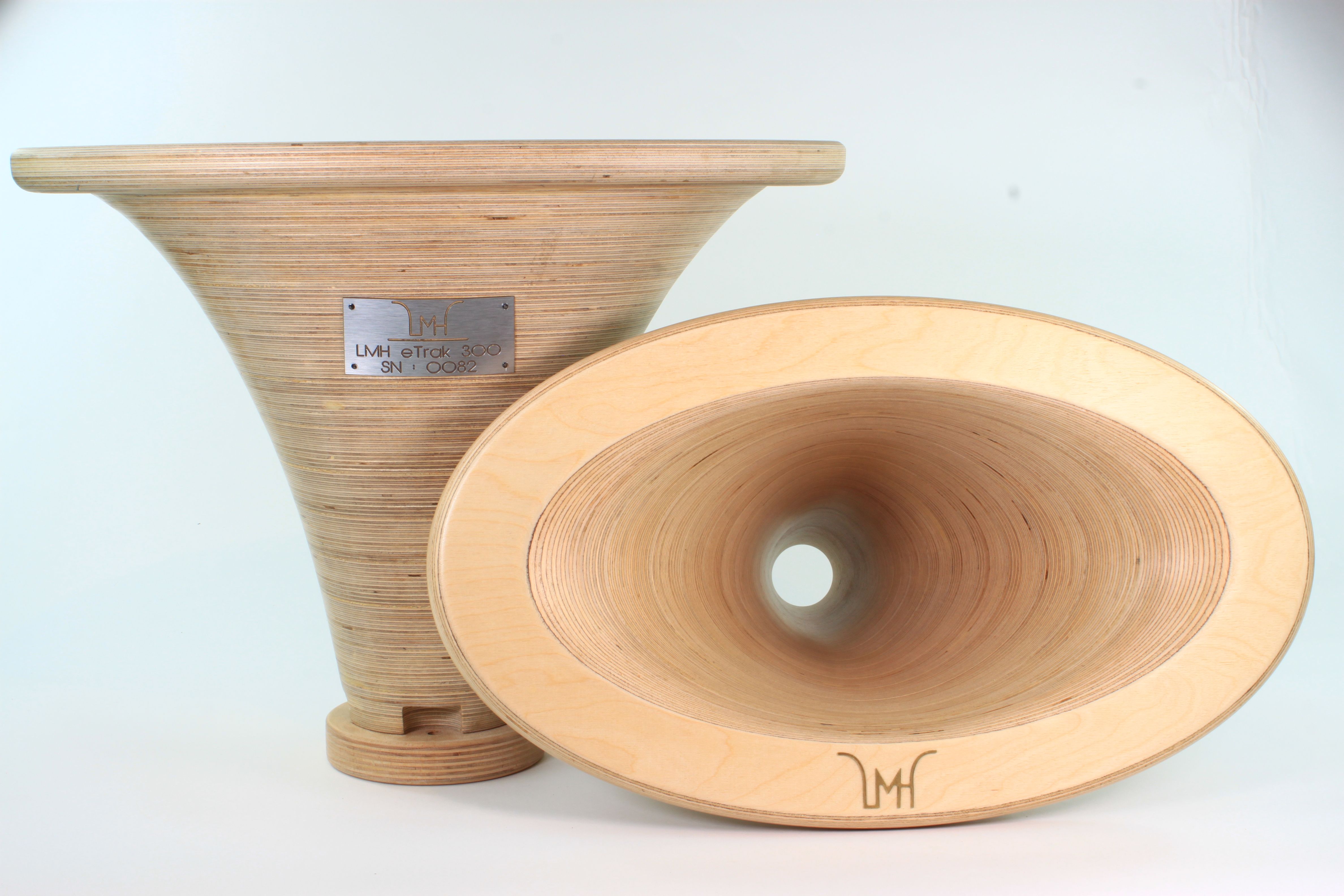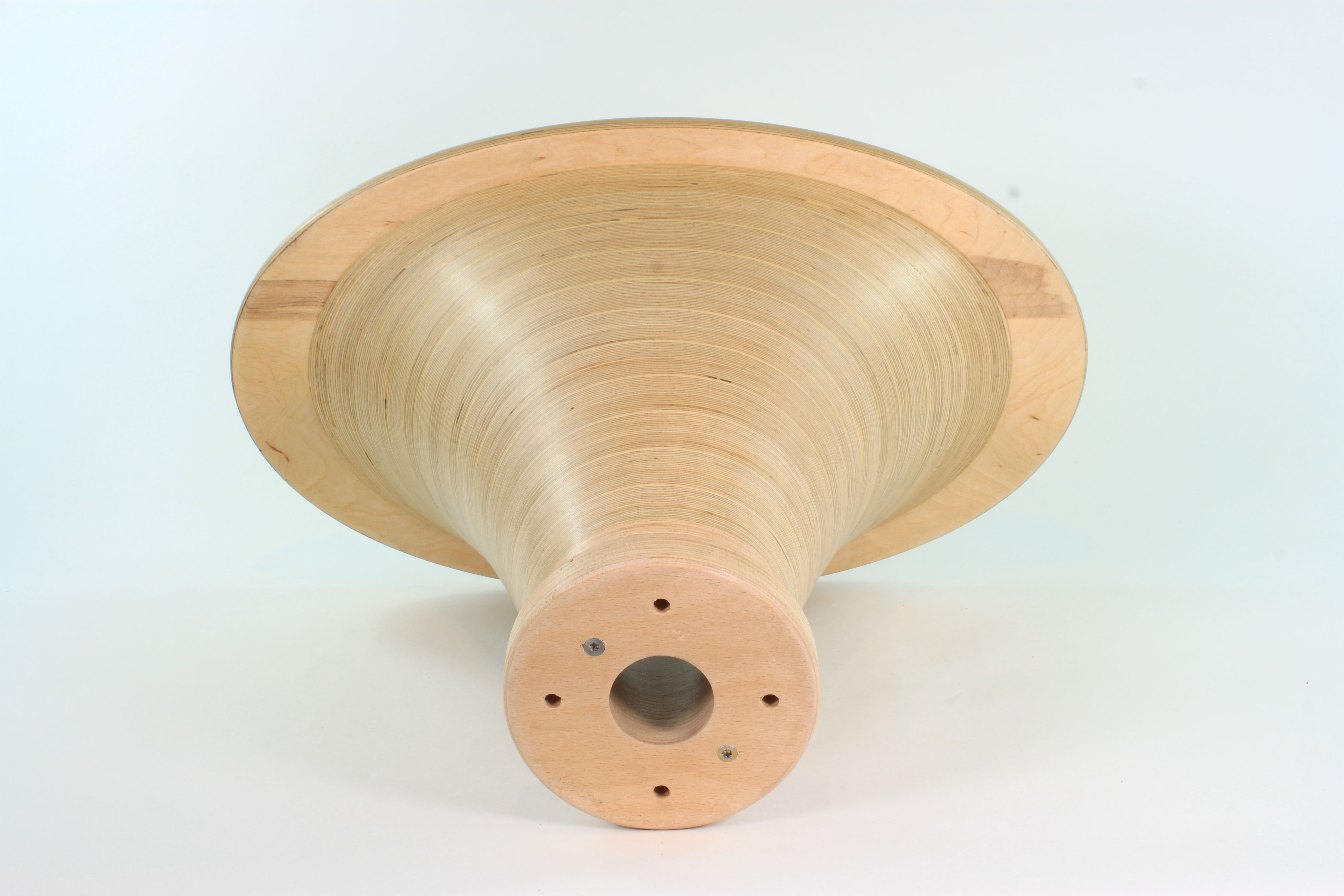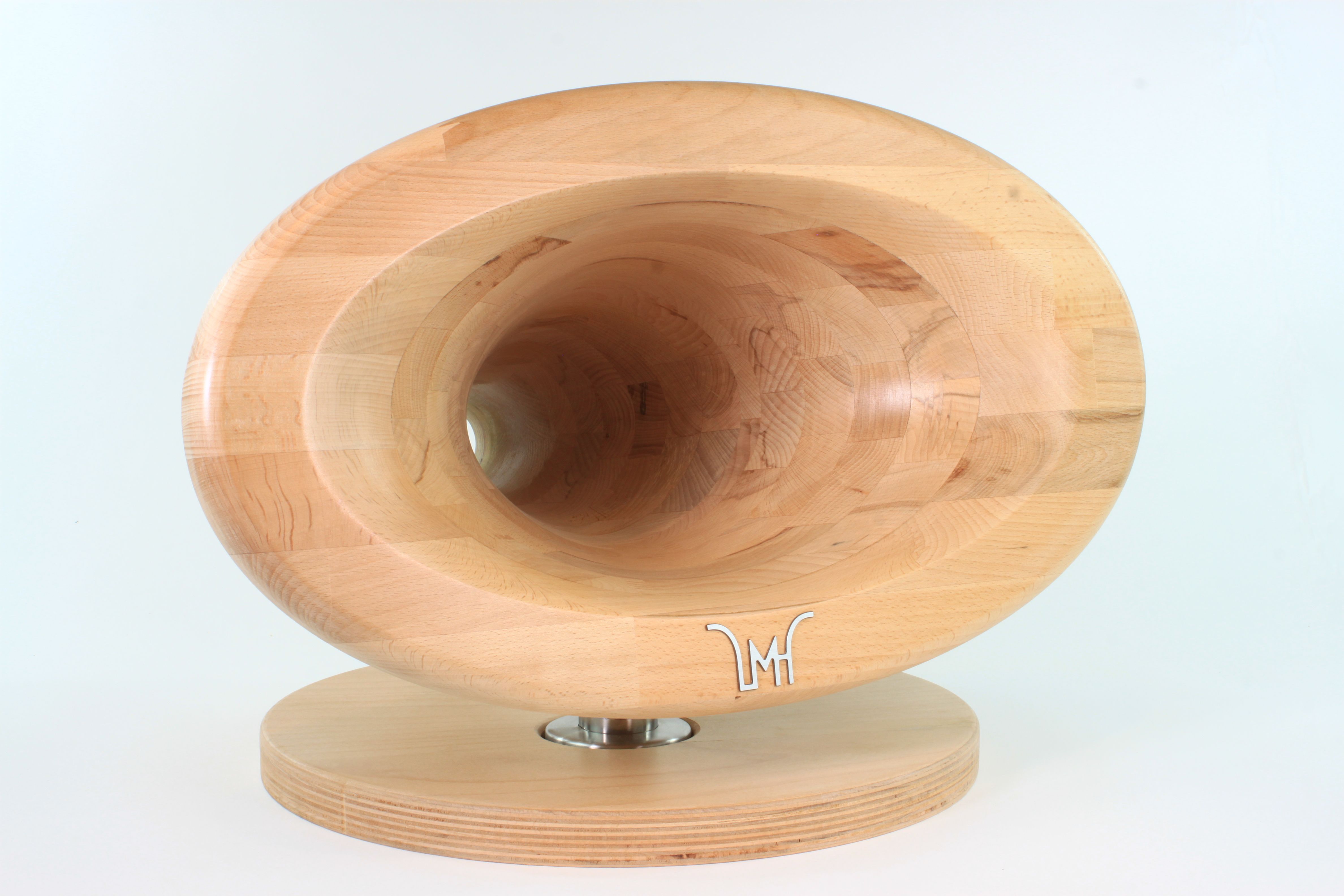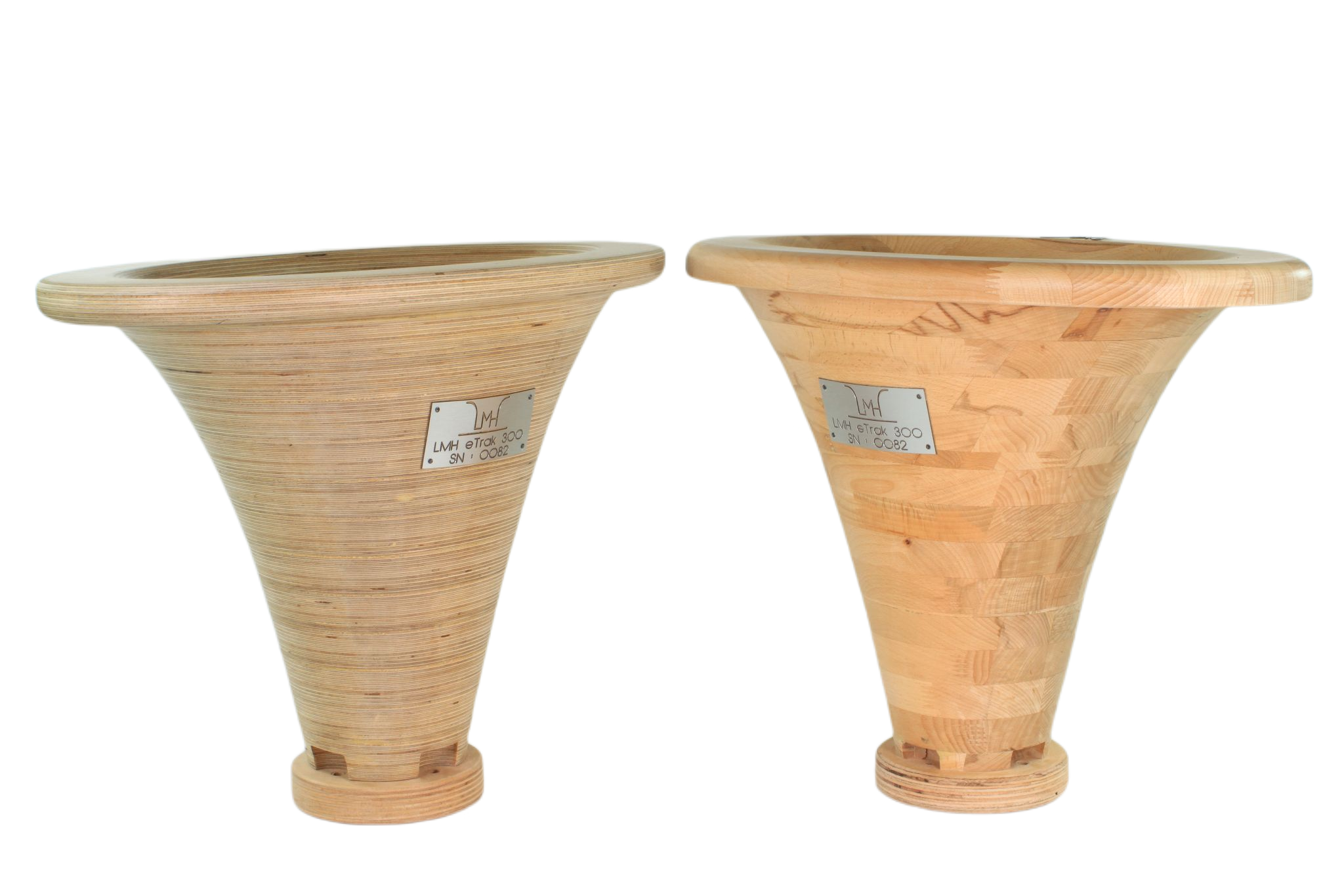 In einem speziell von uns entwickeltem Verfahren aus Vollholz gefertigte sphärisch-elliptische Mittel-Hochtonhörner höchster Güte.
