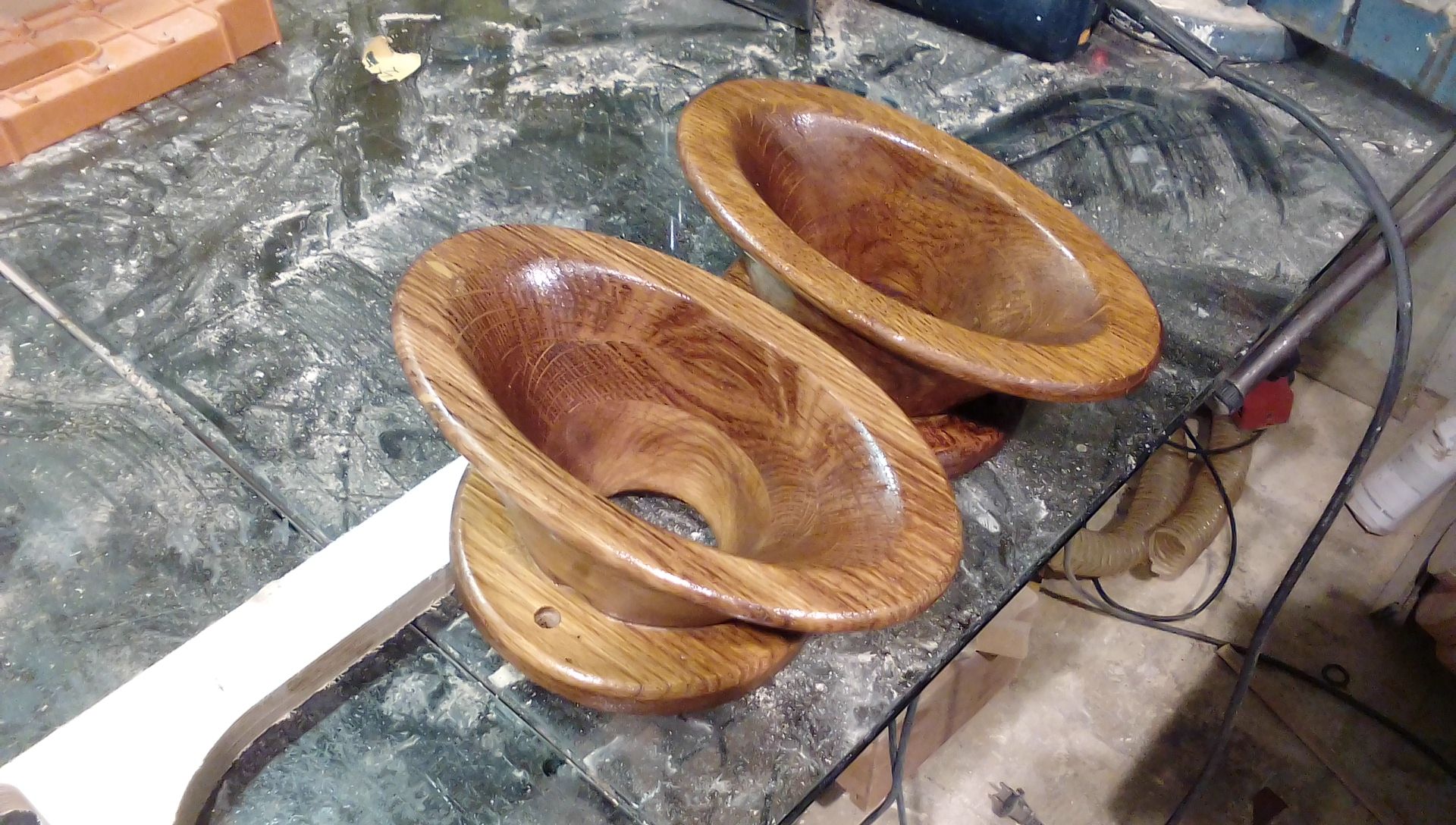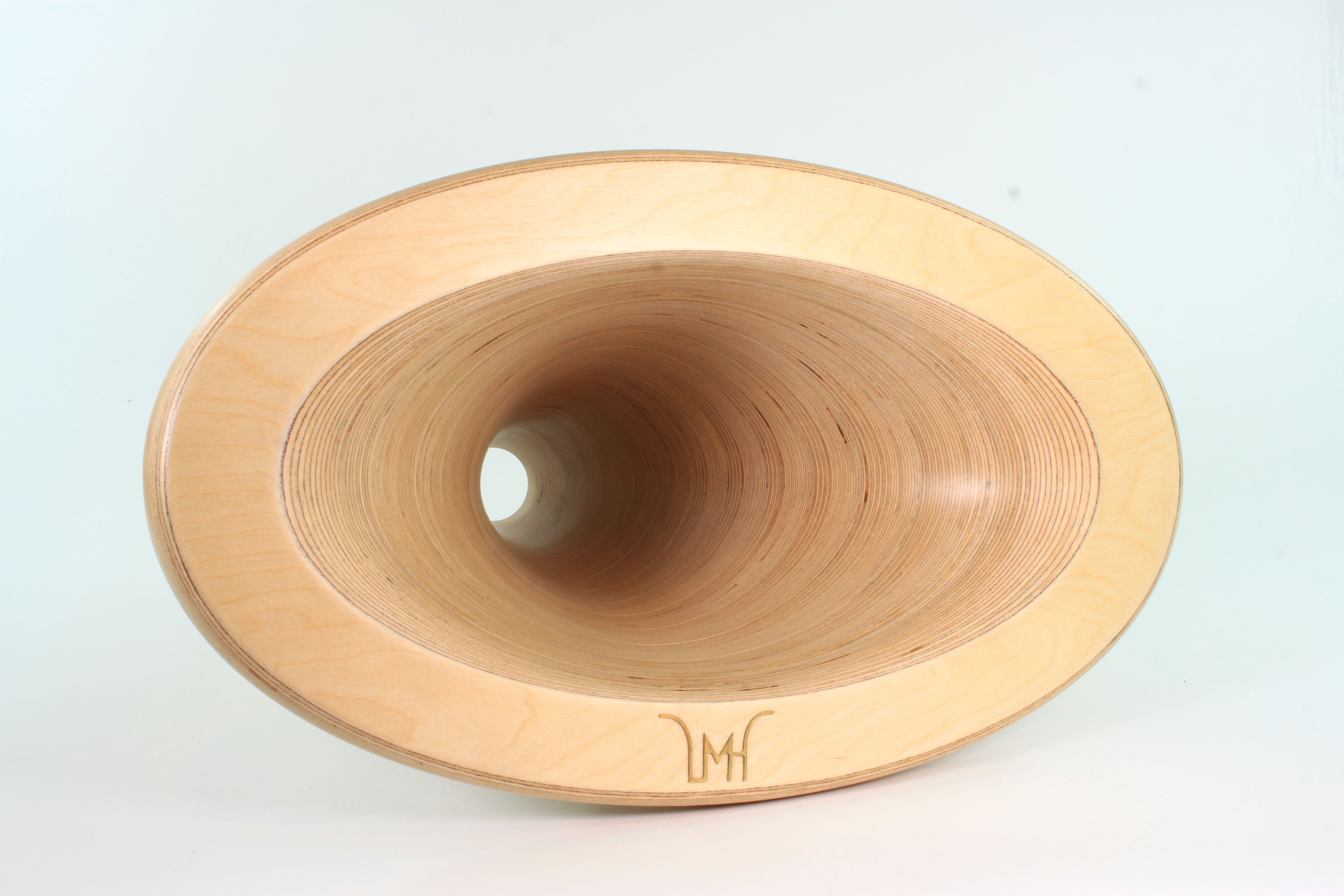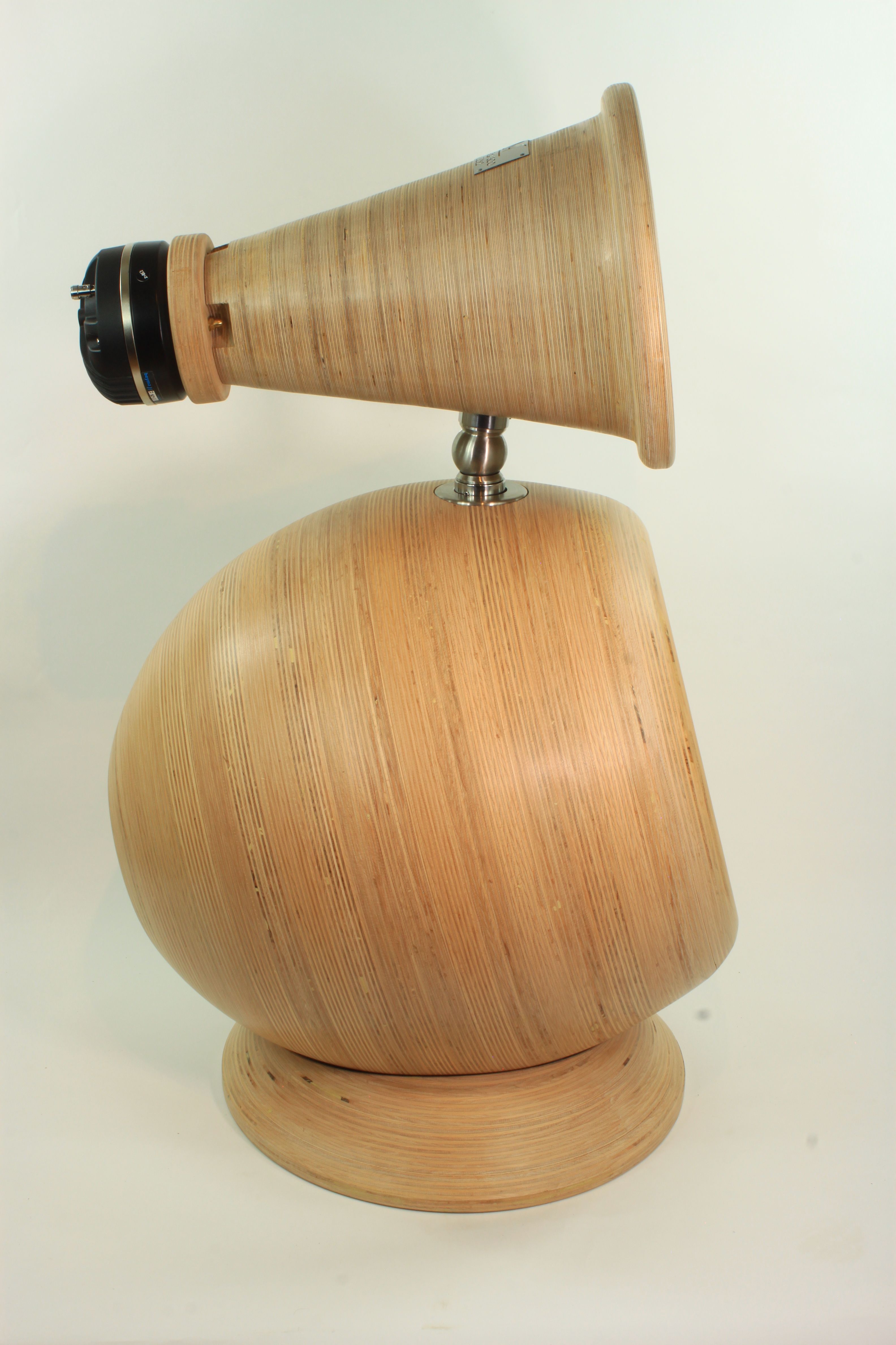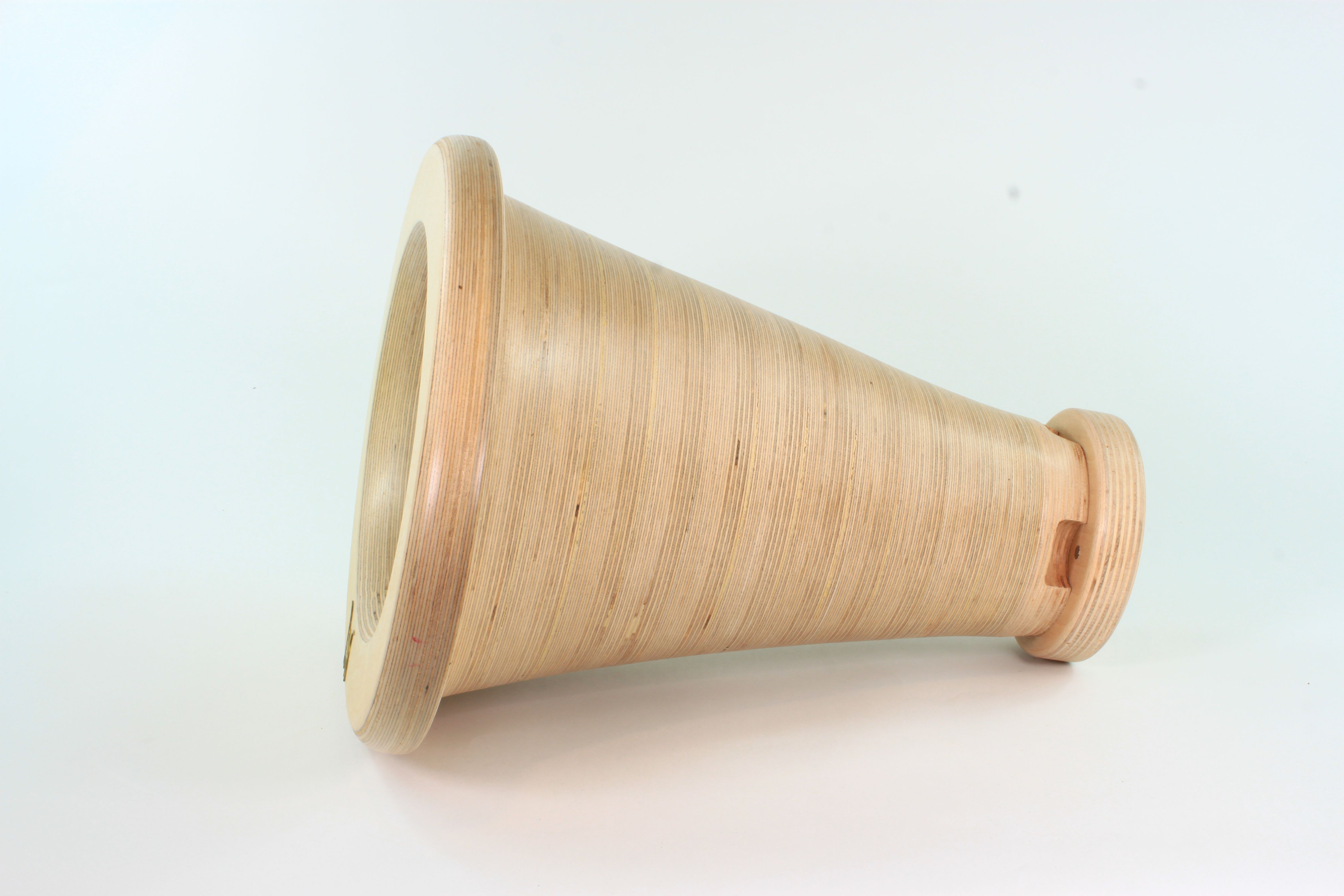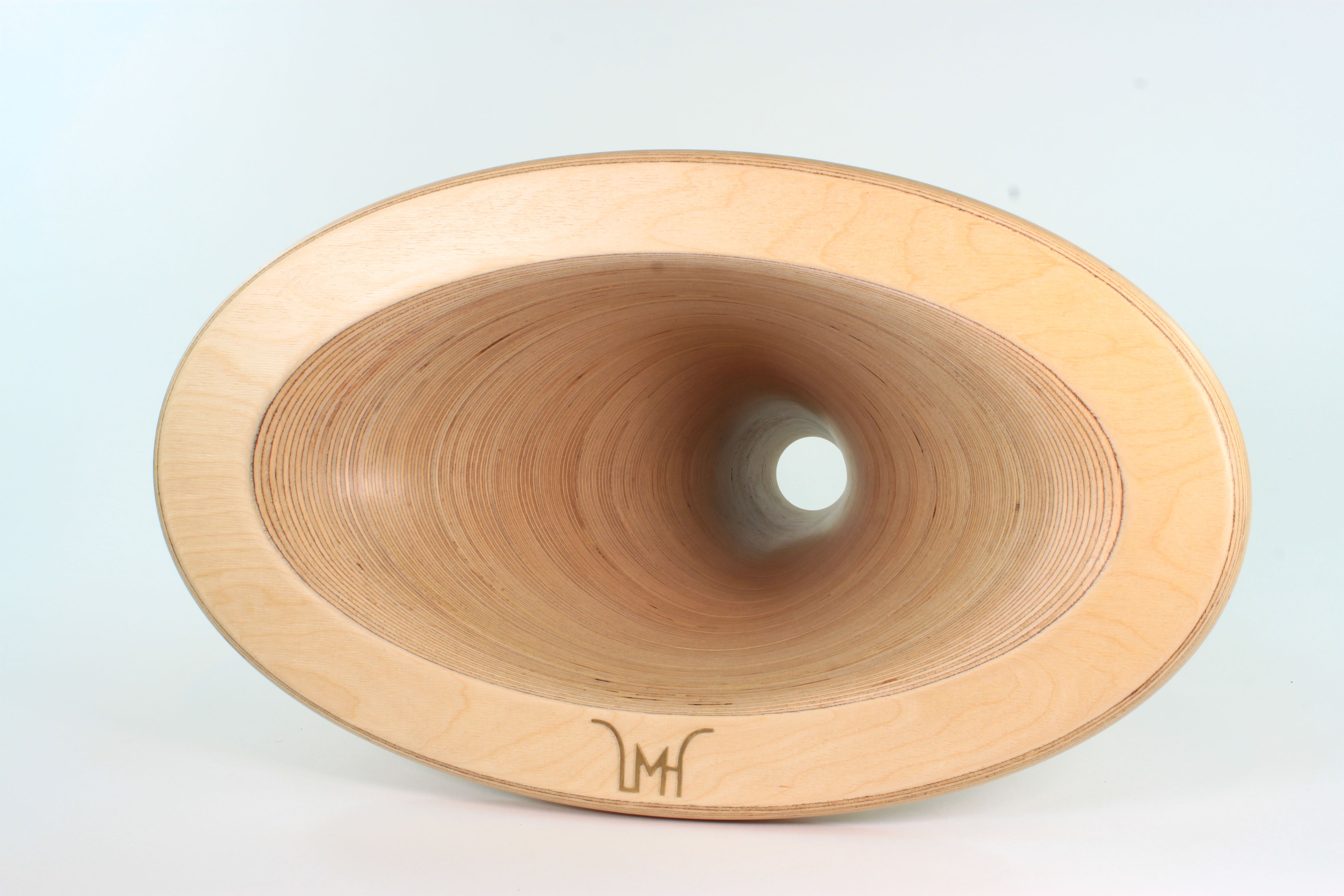 In einem speziell von uns entwickeltem Verfahren aus Vollholz gefertigte sphärisch-elliptische Mittel-Hochtonhörner höchster Güte.