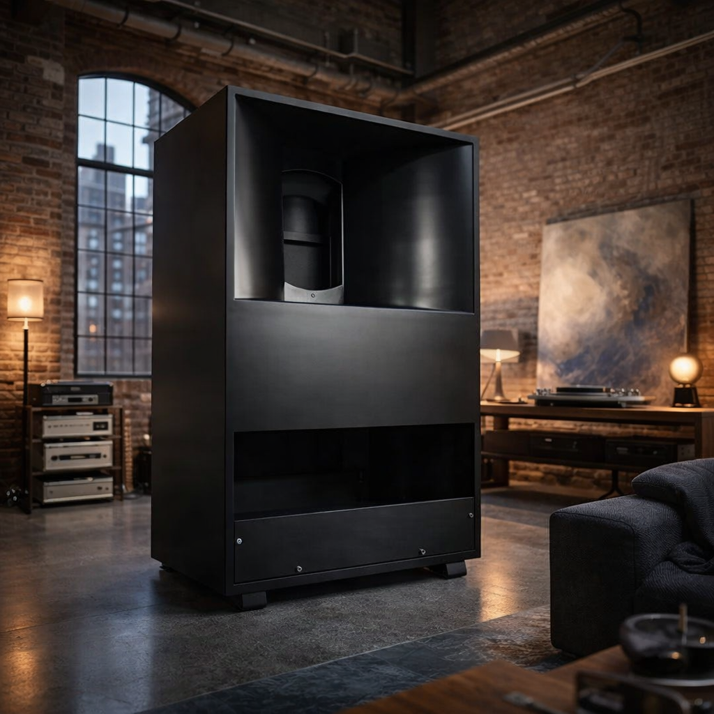 The low-frequency range operates through a short, front-radiating bass horn designed for efficiency and fast transient response.