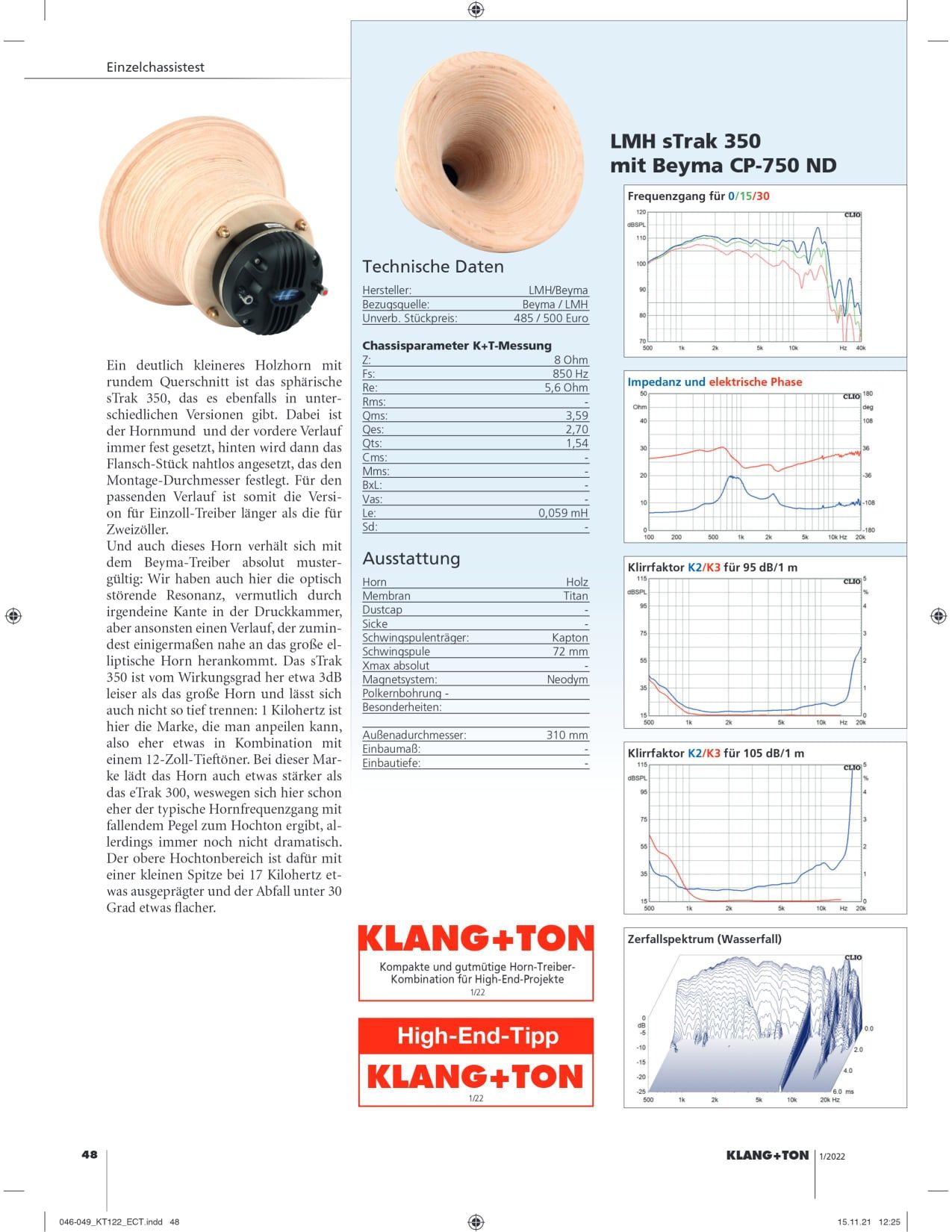 Brillante Mitten & Höhen bis weit über die Hörgrenze (mit geeignetem Treiber). Echte Tractrix Öffnungsformel.